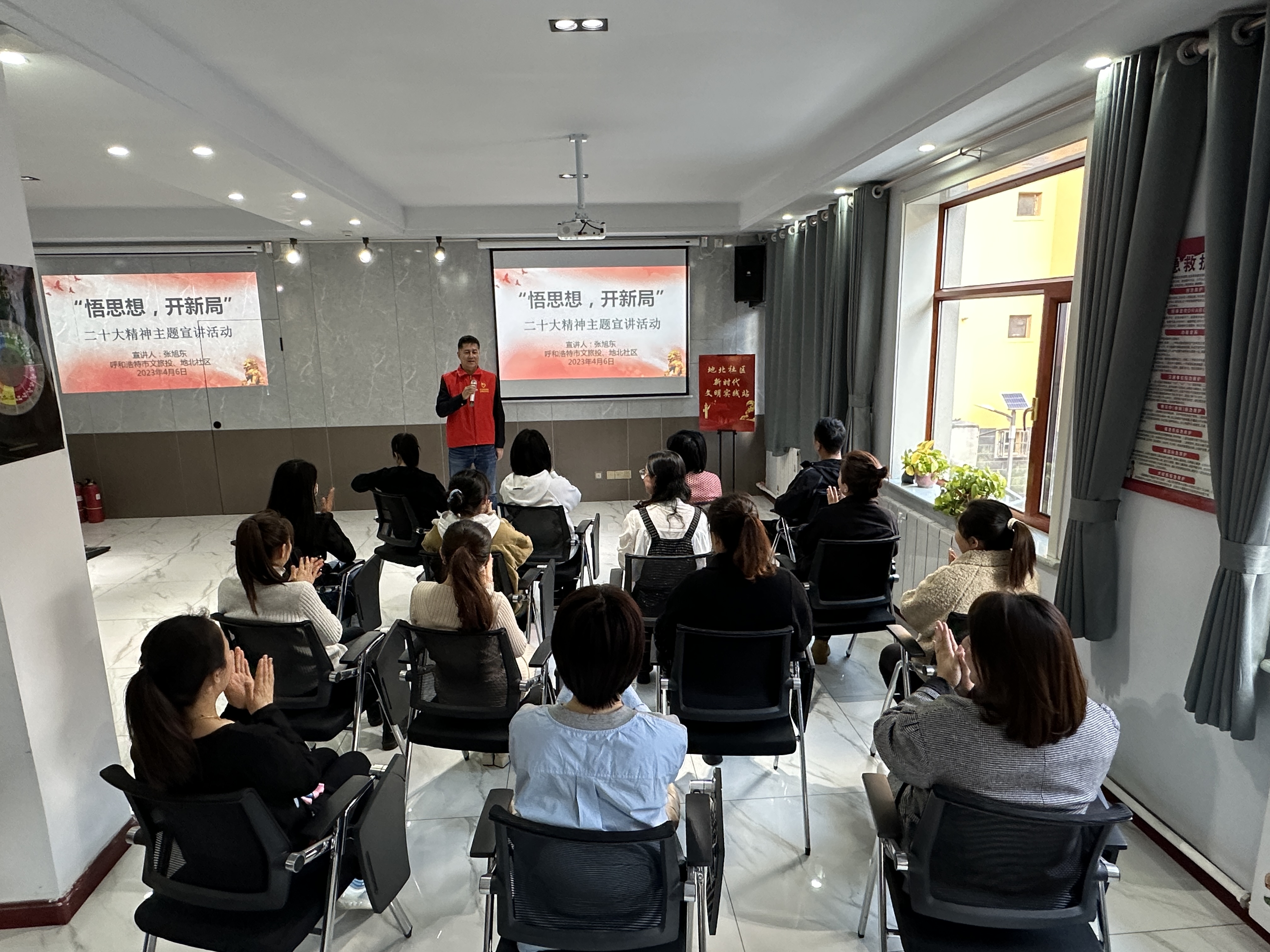 ? ? 4月6日下午,地北社區活動(dòng)室內不時(shí)傳來(lái)陣陣掌聲。市文旅投集團志愿者來(lái)到這里,與基層干部、居民代表圍坐在一起,暢談黨的二十大精神。市文旅投集團第一黨支部副書(shū)記張旭東以“悟思想·開(kāi)新局”為主題作了二十大精神專(zhuān)題宣講,為大家全面解讀了人民至上的內涵、共同富裕的奮斗目標,同時(shí)結合工作實(shí)際,詳細介紹了中國式現代化在呼和浩特市的生動(dòng)實(shí)踐,并為社區及居民下一步工作努力方向提出了建議。通過(guò)張旭東同志深入淺出地宣講,社區工作人員對黨的二十大精神有了更加全面深刻的認識,大家紛紛表示要將黨的二十大精神落實(shí)到為居民群眾服務(wù)和深入實(shí)踐的具體行動(dòng)中。