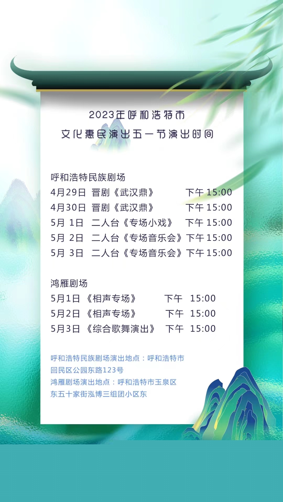 ? ? 五月繁花似錦,綠蔭如海,春意盎然。即將迎來(lái)五一小長(cháng)假,還在為擁擠的景區而煩惱嗎?還在為假期去哪兒而猶豫不決嗎?別急,五一期間,2023年呼和浩特市文化惠民演出來(lái)啦!