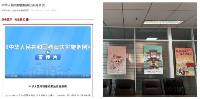 ? ? 市文旅投集團子公司新思路公司利用鴻雁劇場(chǎng)和民族劇場(chǎng)的LED顯示屏對檔案宣傳標語(yǔ)和海報進(jìn)行滾動(dòng)循環(huán),擴大宣傳效果;會(huì )展公司在2024年第十六屆呼和浩特國際車(chē)展暨新能源產(chǎn)業(yè)博覽會(huì )期間,利用展廳電子屏幕滾動(dòng)播放國際檔案日宣傳標語(yǔ),提升了檔案工作的社會(huì )知曉度和影響力;二人臺藝術(shù)研究劇院播放了劇院成立70周年的視頻回顧,通過(guò)珍貴的歷史照片和影像資料,展示劇院在現代化進(jìn)程中的奮斗與貢獻,更是對新時(shí)代二人臺人的鞭策和鼓舞;首府文旅公司充分發(fā)揮景區資源優(yōu)勢,利用大青山紅色文化公園、大黑河軍事文化樂(lè )園大屏播放《檔案法》《中華人民共和國檔案法實(shí)施條例》動(dòng)漫宣傳片等相關(guān)資料,引導大家樹(shù)立法治思維,增強檔案意識。其他子公司也通過(guò)發(fā)布微信公眾號、播放宣傳片、組織員工參加網(wǎng)絡(luò )競答、會(huì )議傳達等形式普及檔案知識,宣傳檔案文化;同時(shí)集團統籌自媒體及各子公司自媒體平臺發(fā)布微信公眾號等各類(lèi)檔案日宣傳信息,充分發(fā)揮新媒體平臺作用,拓展宣傳渠道,號召廣大員工積極參與到檔案管理工作中去,營(yíng)造出“人人都是檔案員”的濃厚氛圍。